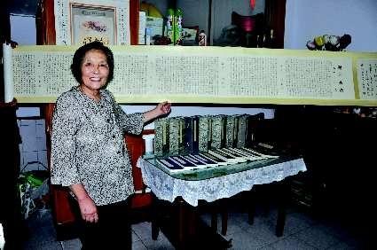 ▲陸新民老人和她的書(shū)法作品。