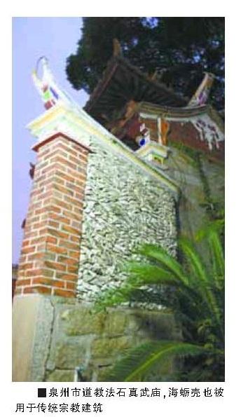 然而就在小洋樓之間,記者見(jiàn)到了蟳埔的另一個(gè)特色——用海蠣殼蓋成的房子,當(dāng)?shù)胤Q作“蚵殼厝”。特別是在老房子集中的村落,“蚵殼厝”一個(gè)連著一個(gè),細(xì)細(xì)看去別有風(fēng)味。有些人家蓋新房的時(shí)候依舊選用海蠣殼做材料,不過(guò)裝飾的意味要超過(guò)就地取材的功能了。記者在村中走訪時(shí)就看到了一處新建的院落,外墻的上半部用海蠣殼填充,裝飾得非常漂亮。院子里面男人、女人分別圍著一個(gè)大桌子吃午飯,中間隔得很遠(yuǎn)。女人們都插著滿頭的鮮花,根據(jù)記者幾天來(lái)了解的情況分析,這一天應(yīng)該是對(duì)這個(gè)家庭非常重要的日子。院子里正對(duì)大門(mén)的是祠堂,房子的女主人告訴記者,他們建這個(gè)院子花了30萬(wàn)元,平時(shí)并沒(méi)有人住,這里只是供奉、祭祀祖先的地方。