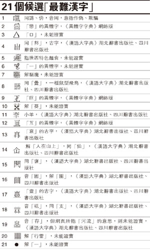 中新網(wǎng)10月22日電 身為中國人,就應(yīng)該懂中文字,你又認(rèn)得幾多個(gè)?據(jù)香港明報(bào)報(bào)道,有網(wǎng)民在網(wǎng)上搞“最難漢字”評選活動(dòng),選出21個(gè)一般人不認(rèn)識的生字候選,個(gè)個(gè)令人摸不著頭腦。