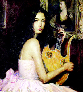 當(dāng)華人社區(qū)對(duì)這位“英雄”贊不絕口時(shí),徐純中也成了最受好萊塢明星歡迎的畫家。畫冊(cè)中一幅《甜蜜的琴聲》正是當(dāng)紅女星凱瑟琳.澤塔.瓊斯的肖像畫。據(jù)徐純中回憶,澤塔.瓊斯當(dāng)時(shí)特地從好萊塢借了一把十分名貴的古琴,還選了一件粉色衣服,來突出自己象牙白的膚色。不過,性格活潑的澤塔.瓊斯每次坐不到十分鐘,就要起身吃東西、接電話,或者吩咐仆人做什么事。徐純中笑說,“過了3個(gè)半小時(shí),我還沒有畫完,澤塔.瓊斯有些不耐煩了。于是,我只能帶著未完成的初稿回去上色。作品完成后,她對(duì)我的作品非常滿意,并與我相約每隔兩年,為她畫一次肖像,現(xiàn)在我已經(jīng)著手第三幅了。”
