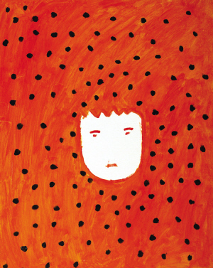 郭海平問記者:“如果是你,會(huì)如何表達(dá)‘掙扎’的抽象精神?”隨即他讓記者看了張玉寶的作品:沖擊力極強(qiáng)的橘紅色背景上,被扎上了無(wú)數(shù)個(gè)錯(cuò)亂且刺眼的黑點(diǎn),它們環(huán)繞在一個(gè)人頭四周,人臉表情有些呆滯。色彩強(qiáng)烈的反差,讓人感覺周圍恐怖的背景,隨時(shí)可能將人頭吞噬,人頭似在苦苦掙扎。整個(gè)畫面是那么干凈,但內(nèi)涵卻非常豐富。無(wú)論如何,你都不能猜到這是一個(gè)未經(jīng)任何繪畫訓(xùn)練的人畫出來的東西。