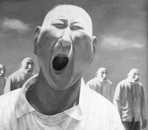 話題是從他“窮得要死”的時候說起的。方力鈞1963年出生在河北邯鄲。“文革”中,父親不許他外出而閉門在家里學畫。特殊的環(huán)境養(yǎng)成他的“倔脾氣”。中專時,學校規(guī)定不許留長發(fā),于是他便和幾個挨批評的同學一起把頭發(fā)剃個精光。這個情結是否孕育了他日后的畫風不得而知,而他自己的解釋是,光頭有點叛逆,但又含義曖昧,和尚光頭,犯人也光頭。他選擇畫光頭,是因為這樣可以模糊個差異性,而突顯人的整體象征意義。