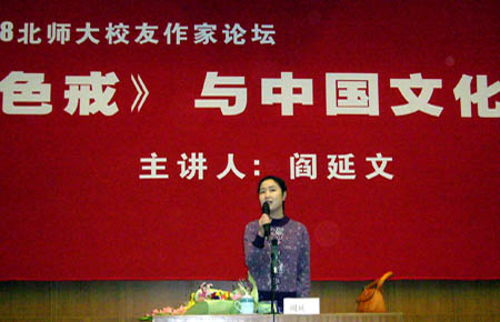 日前,女作家閻延文應(yīng)母校北師大文學(xué)院邀請(qǐng),在北師大針對(duì)文化熱點(diǎn)問(wèn)題,進(jìn)行了一場(chǎng)題為《色戒與中國(guó)文化》的講座。英東學(xué)術(shù)會(huì)堂,在講座開始前即已爆滿,兩個(gè)小時(shí)的講座始終處在熱烈氣氛中。
