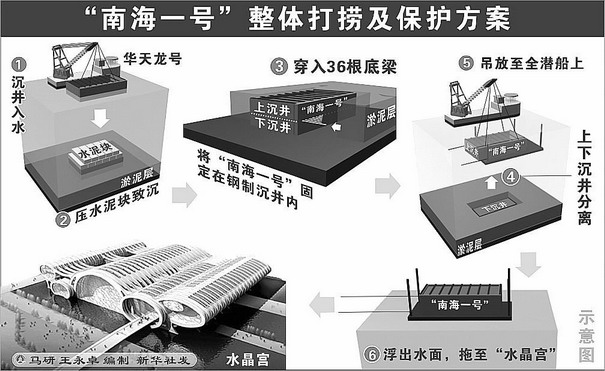 魏峻說(shuō),由于“南海一號(hào)”所在海域的海水能見(jiàn)度幾乎為零,水太深,采用傳統(tǒng)的水下考古方法,將無(wú)法對(duì)沉船和船載文物進(jìn)行準(zhǔn)確的測(cè)繪和記錄,必然會(huì)造成不少珍貴文物考古信息的丟失。古沉船在水下浸泡了800多年,船體非常脆弱,即使船載文物全部打撈出水,對(duì)于沉船本身的水下考古打撈也將會(huì)是一件非常困難的工作。因此,經(jīng)多方面專家的反復(fù)論證和研究,決定對(duì)“南海一號(hào)”沉船進(jìn)行整體打撈:將沉船、載物與其周圍泥沙按照原狀固定在特殊的鋼制沉箱內(nèi),將分散、易碎的文物一體化、一次性吊浮起運(yùn),然后遷移到能人為控制環(huán)境、保護(hù)較好的“水晶宮”中進(jìn)行科學(xué)的水下考古發(fā)掘。