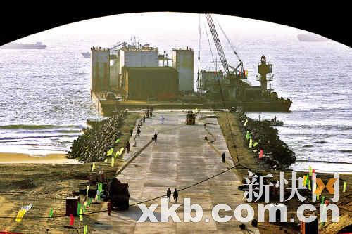 記者在碼頭上看到,這里還堆放著8塊6.15×2.3米的2厘米厚鋼板,這就是讓“南海I號(hào)”登陸的跳板了。此時(shí)船上的工作人員也開始用吊機(jī)將一個(gè)個(gè)氣囊放在沉箱的兩邊,準(zhǔn)備在沉箱底部放入氣囊。7時(shí)45分,岸上的拉移工程人員到達(dá)現(xiàn)場(chǎng),將電線接入設(shè)備中并鋪設(shè)鋼索。