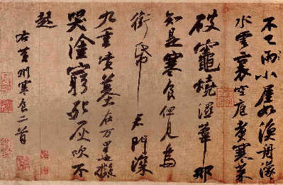 “蘇軾書作分早、中、晚三個(gè)時(shí)期:早年姿媚,中年圓勁,晚年豪放。就筆法看,《春風(fēng)》恣意揮發(fā),氣勢(shì)磅礴,飄逸豪放,當(dāng)屬晚年作品!毙靻⑿叟袛,《春風(fēng)》應(yīng)為蘇軾在“烏臺(tái)詩(shī)案”后被貶居惠州、海南,生活窘迫但仍受當(dāng)?shù)厝藷崆榻哟,以?shī)詞、書畫回贈(zèng)所為,因此得以在民間保存。