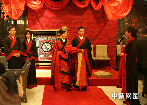 據(jù)新人說,穿上自己民族的禮服——漢服,為自己舉辦一場漢民族傳統(tǒng)婚禮,在越來越多代表民族傳統(tǒng)的東西被重新表達的今天,是件十分有意義的事。莊重、質(zhì)樸的周制婚禮儀式上的神圣,對“孝敬父母”、“夫婦之義”、“人倫之本”等民族精神內(nèi)涵的深刻闡述,都是時下泛濫的西式婚禮所遠遠不能與之相比的。