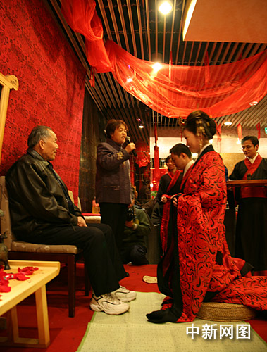 中新網(wǎng)1月20日電 1月19日晚,北京一對新人舉行了一場莊重典雅的漢民族傳統(tǒng)婚禮——周制婚禮,新人服飾、現(xiàn)場布置和儀程設計,均以自周流傳至秦、漢的婚俗為依托。