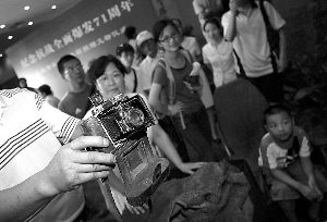 一名工作人員展示飛行員專用相機。昨天是抗戰(zhàn)全面爆發(fā)71周年紀念日,20余件飛虎隊文物落戶中國人民抗日戰(zhàn)爭紀念館。這批文物是現(xiàn)年91歲的原飛虎隊成員吳其軺在抗戰(zhàn)時期配發(fā)的用品。如此批量、成套的飛虎隊文物在國內同時披露非常少見。(記者 薛珺 蔣彥鑫 攝影報道)