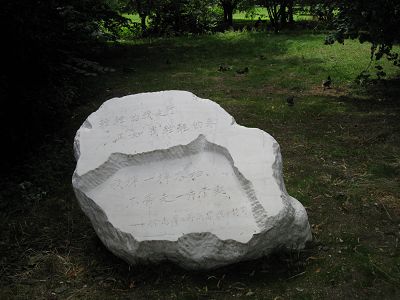 劍橋的一位中國朋友,江·西蒙將《再別康橋》的首行和末行刻在了石碑上,并將它帶到劍橋。石碑用的是北京的白色大理石(這與構(gòu)筑北京紫禁城的大理石質(zhì)地完全一樣),立在此地以作為連接中國與國王學(xué)院間紐帶的標(biāo)志。陳肖秋 編譯