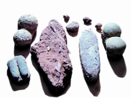 “這是村民們開山修筑趙營村至金花村‘村村通’公路時發(fā)現(xiàn)的。”張豐臣說,“目前,僅新修公路沿線兩公里范圍內(nèi)就發(fā)現(xiàn)有二十多窩這樣的恐龍蛋化石,估計實際蘊(yùn)藏量不下100窩。同時還發(fā)現(xiàn)了樹枝蛋、戈壁棱柱形蛋等十多種恐龍蛋化石!痹诖宀,張豐臣向記者展示了臨時保存的修路施工中拾到的蛋化石和龍骨化石。