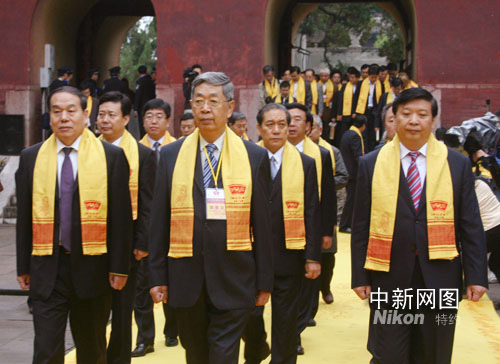 古磬敲響,身披黃色綬帶的朝圣者們莊嚴(yán)步入屬于先哲的歷史時空,在杏壇與大成殿間緩緩止步。抬首仰望,巍然聳立的孔廟大成殿正如至圣先師,于云霧之間俯視黎庶,巋然等待著后世眾人的朝拜!袄^往開來,永興此邦……”在山東省政協(xié)主席孫淑義的主持下,公祭大典開始。《天人合一》、《與時偕行》、《萬世師表》等樂章依次響徹孔廟,在身著明代祭服的舞者簇?fù)碇拢袊珖舜蟪N瘯蔽瘑T長許嘉璐、中國文化部副部長周和平、中共山東省委副書記、省長姜大明、聯(lián)合國教科文組織代表、孔子教育獎獲獎代表、著名書畫家范曾等朝圣者分別向先師孔子敬獻(xiàn)花籃。