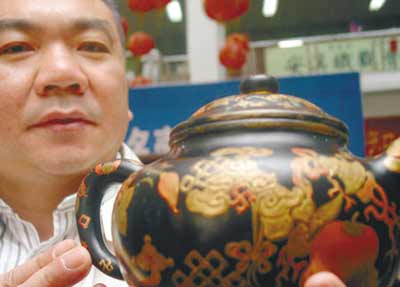 在當天沈陽茶城主辦的紫砂名壺拍賣會上,一把乾隆年間宮內御用的“宜興窯紫砂黑漆描金吉慶有余壺”以155萬元的天價拍賣成功,這個成交價格也打破了此前香港佳士得拍賣行拍賣一件清乾隆剔紅饕餮夔龍紋紫砂壺時147.7萬港元的歷史最高價紀錄。