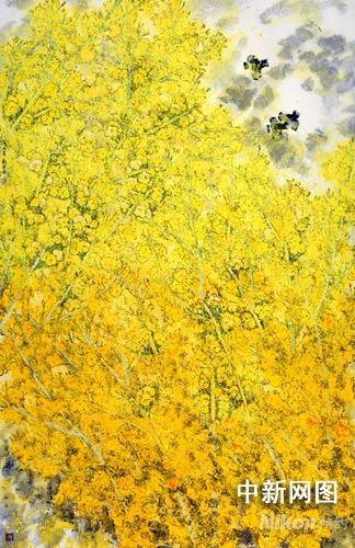龐舜堯在油菜花系列組畫(huà)的創(chuàng)作上,與傳統(tǒng)意義上的寫(xiě)意花鳥(niǎo)畫(huà)有著明顯不同。組畫(huà)以潑彩為主,富于抽象意味,作品以耀眼奪目的黃色寓意3月的萬(wàn)物復(fù)蘇與生命活力的四溢,大面積的黃色,以深淺不同、明暗差別體現(xiàn)3月菜花遍地黃的詩(shī)意景象。在該套作品里,油菜花的具體性已經(jīng)被剝離剩下的近乎成為抽象的意向感覺(jué),明麗的黃色刺激著視覺(jué),讓人興奮。