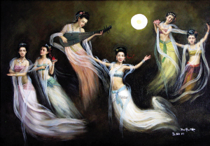 朱澤斌還講述了靈感的來源:“一輪月光照著寒冷朦朧的天空,6個(gè)仙女在廣寒宮周圍飛翔著、舞蹈著。她們身穿著宮衣、游泳衣和運(yùn)動(dòng)衣組合的服飾,飛到一起來了,飛向了廣州。去年中秋節(jié)凌晨,此情此景進(jìn)入了我的夢(mèng)中。第二天醒來,我把夢(mèng)中見到的便作了這幅畫!