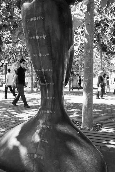 北京街頭的藝術(shù)雕塑,標(biāo)示著人體的主要穴位。