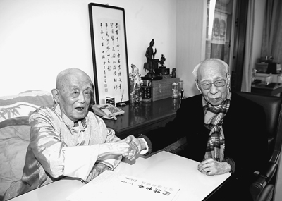 “您是我們國家最高的老師!”10月28日下午,香港著名學(xué)者饒宗頤(上圖右)專程來到北京解放軍總醫(yī)院看望北京大學(xué)教授季羨林時,這樣稱呼這位學(xué)界泰斗(圖為王天天攝)。
