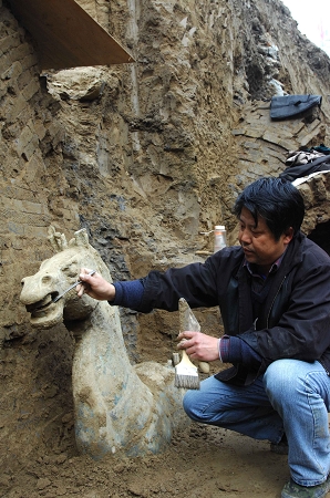 近日,考古人員在襄樊市長虹路一建設工地進行搶救性發(fā)掘時,發(fā)現(xiàn)一大型魏晉早期墓葬,并從該墓葬后室中發(fā)掘出玉璧、水晶珠、青銅熏爐等數(shù)十件珍貴器物。專家們從出土的文物分析,該墓應是魏晉早期的夫妻合葬墓,墓主人的身份相當于大將軍級別。隨后,考古人員在發(fā)掘、清理前堂文物時,又發(fā)現(xiàn)了一匹與真馬體形接近的青銅馬。到昨天,整個銅馬已露出泥土80厘米高。據(jù)初步分析,銅馬高度為1.8米左右,重約2噸。
