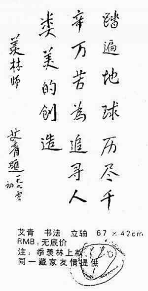 艾青妻子在看到復印件中艾青的書法作品后對北京媒體表示,這幅作品可100%肯定為假的:“從哪方面來說都是假的,艾青和季羨林沒什么交往,從字跡來說是假的,從年代上來說也不可能。”艾青兒子艾丹也認為,艾青比季羨林年長,不可能稱季羨林為“羨林師”。