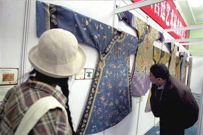 在展示現(xiàn)場的清宮龍袍中,有一件清順治龍袍估價(jià)1500萬元,這樣的估價(jià)是因?yàn)樗跃哂小耙淮缇~絲,一寸金”之稱的緙絲縫制而成。據(jù)考證,這件龍袍是順治帝所穿,后流落民間,至今保存完好,具有極高的歷史價(jià)值。