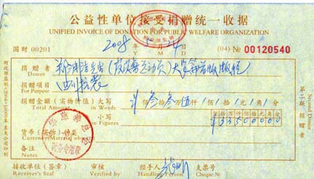 捐款收據(jù)(圖片來源:鄭淵潔新浪博客)
