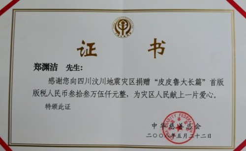 捐款證書(圖片來源:鄭淵潔新浪博客)
