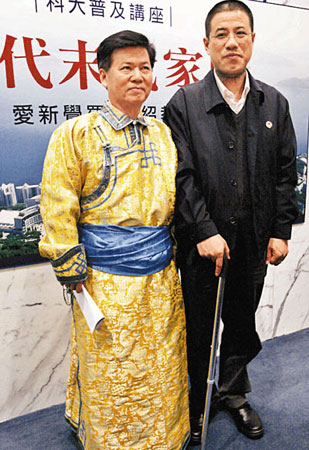 科大老師穿上愛新覺羅恒紹(右)帶來的皇家滿族服飾,一沾“皇氣”。(圖片來源:文匯報)