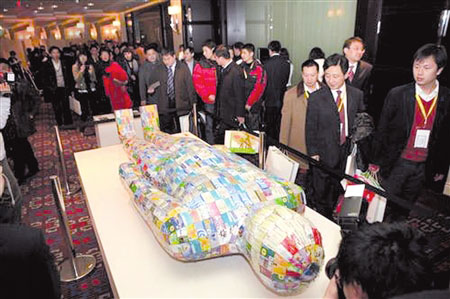 不久前,國(guó)內(nèi)的金融界人士匯聚北京,但在會(huì)議期間,他們被現(xiàn)場(chǎng)一件當(dāng)代雕塑給震撼了,這是一個(gè)身長(zhǎng)3.3米,用去1720張銀行卡、充值卡和消費(fèi)卡,使用100米銅線,完全采用漢代手工技藝制成的“金縷玉衣”,外形和1968年出土的那件文物一模一樣。據(jù)刁建中介紹,這件作品的名字叫《金縷玉衣2008》,創(chuàng)作歷時(shí)15個(gè)月,從多年收集的萬(wàn)余張卡中精心挑選了1720張卡。他表示,選擇“卡”作為介質(zhì),因?yàn)榭ㄗ鳛樽髌返乃囆g(shù)元素具有廣泛的社會(huì)屬性,是對(duì)人們消費(fèi)的一種梳理和認(rèn)同。刁建中希望通過(guò)這種承載大量社會(huì)信息的卡借用金縷玉衣的形式來(lái)表達(dá)當(dāng)代的社會(huì)現(xiàn)象。