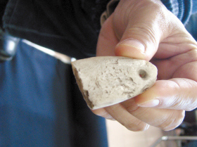 文物中有一個非常漂亮的魚形石刀殘片——一個長五厘米左右的石制“魚頭”,魚頭上刻著魚眼和魚鱗,很精美。趙殿坤說,這是當(dāng)時用的切割工具。由于它比較小,所以做得精致,很有文物價值。