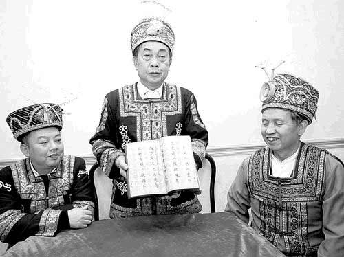 1月3日,貴州省仡佬學(xué)會(huì)副會(huì)長(zhǎng)付爾光(中)在遵義向記者展示新近發(fā)現(xiàn)的漢字對(duì)照仡佬文《九天大濮史錄》。這本仡佬文用朱砂書寫、漢文為黑墨對(duì)照,記述仡佬族人發(fā)展歷史的書,據(jù)說(shuō)就是傳說(shuō)中的仡佬族天書。該書的發(fā)現(xiàn)結(jié)束了仡佬族只有語(yǔ)言而無(wú)文字的說(shuō)法。