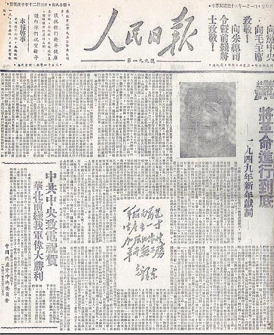 3.1949年1月1日《人民日?qǐng)?bào)》第1版刊登的新華社社論《將革命進(jìn)行到底 ——一九四九年新年獻(xiàn)詞》