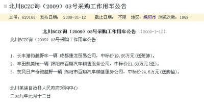 網(wǎng)友在《北川政府110萬采購豪華越野車》的帖子中,展示了一張名為“北川采購工作用車中標(biāo)公告”的截圖,而韓寒在其博客里引用“來自綿陽政府采購網(wǎng)”的資料,列舉綿陽購買的10萬余輛車一覽,所有越野車的價格都在10萬到100萬之間。其中有長豐獵豹、東風(fēng)日產(chǎn)奇駿、豐田普拉多等10萬以上的越野車,價格在50萬以上的車就有4輛,其中就有豐田普拉多VX4.0導(dǎo)航版,價格62.60萬元。另外還不乏像蘭德酷路澤頂配這樣的百萬豪車,所有車的總價值超過400萬。