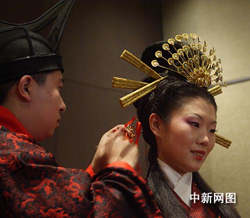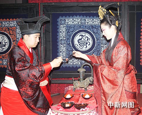 中新網(wǎng)2月2日電 春節(jié)期間,一對山東濟(jì)南新人專程來京,舉辦了一場莊嚴(yán)神圣的周制婚禮。與以往婚禮不同處在于,此次婚禮并未邀請賓客,且全場參禮者均著漢服,故而由醮子、催妝、送親、合巹、拜父母恩等環(huán)節(jié)組成的整場儀程就顯得尤為高貴典雅、神圣肅穆,傳統(tǒng)漢婚文化被演繹成類似情景劇的形式,漢“昏禮”元素被彰顯的淋漓盡致。