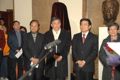 北京市委常委、宣傳部長、副市長蔡赴朝,老舍先生的子女舒乙先生、舒濟女士和舒雨女士,以及參加國際老舍研討會的一百八十余位專家學(xué)者,北京人藝全體院領(lǐng)導(dǎo)和各部門代表,當(dāng)年《龍須溝》首演陣容的演員代表鄭榕、李濱、舞美設(shè)計宋垠、韓西宇等,于是之先生的夫人李曼宜女士,新版《龍須溝》劇組代表顧威導(dǎo)演,老舍頭像作者、中央美術(shù)學(xué)院教授、雕塑藝術(shù)家孫家缽等出席了揭幕儀式。當(dāng)晚7時許,蔡赴朝和舒乙一起,共同為老舍先生雕塑揭幕。至此,中國近代文學(xué)史上的三位大師——老舍、焦菊隱、曹禺的銅像共同屹立、“聚首”在首都劇場大廳內(nèi),供后輩瞻仰!