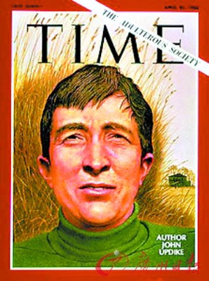 1968 年的小說《夫妻們》描寫了小鎮(zhèn)中產(chǎn)階級家庭組織的換妻派對,令他榮登當(dāng)年4 月26 日《時代》周刊的封面,大標(biāo)題赫然印著“通奸社會”(The Adulterous Society)。2005 年他的小說《村莊》入圍英國老牌文學(xué)雜志《文學(xué)評論》一年一度的“最差性愛描寫?yīng)劇遍L名單,還好,性愛描寫最終不敵蓋爾斯克倫的《溫克勒》,沒有得獎。