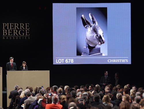 當(dāng)?shù)貢r(shí)間2月25日,佳士得拍賣(mài)行在巴黎大皇宮舉辦的“伊夫·圣羅蘭與皮埃爾·貝爾熱珍藏”專(zhuān)場(chǎng)拍賣(mài)會(huì)上拍賣(mài)圓明園流失文物鼠首和兔首銅像,在不到5分鐘的時(shí)間里,兩件文物分別以1400萬(wàn)歐元被買(mǎi)家通過(guò)同一電話代理人買(mǎi)走。