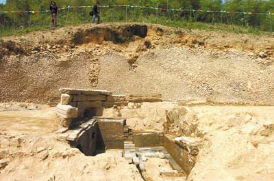 汪大猷墓位于余姚市大隱鎮(zhèn)下磨村后山。記者昨天趕到現(xiàn)場,老遠(yuǎn)看到一座山,幾乎半個面都被開掘出來,相當(dāng)壯觀。沿著泥沙路往上走,路慢慢地變窄。不一會,前方出現(xiàn)一條亂石鋪成的道路。參與此次考古發(fā)掘的考古隊隊員羅鵬告訴記者,這是墓前的神道,以前神道兩旁各有對稱的石羊、石馬、石虎和石人4對石像生。不過年代久遠(yuǎn),其中幾座遭到損壞,現(xiàn)尚有4座保存在村民家中。記者眼前只見磚頭搭起的基座。