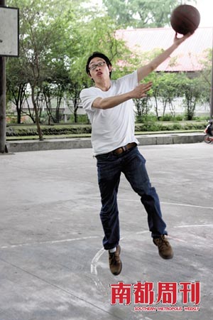 4月23日,范美忠?guī)в浾呋毓鈦喼袑W。穿著短袖衣服的他,就像一個剛下宿舍的大學生,在校門附近的籃球場打起了籃球。光亞幼兒園的小朋友正在場地的另一邊玩游戲,喇叭開得很大聲,而他似乎什么都看不見,聽不到,照樣小跑,上籃,跳投。