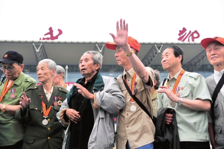 16時許,這批年齡都在80余歲左右的“四川老兵”陸續(xù)來到了報社門口集合。大家的表情顯得有些興奮,雖然是臨時接到接機的通知,老人們還是精心準(zhǔn)備了一番,每個人都戴上了建川博物館送給他們的紀(jì)念抗日戰(zhàn)爭勝利60周年徽章,82歲的王世雨老人的左胸上,更是戴滿了記錄著他崢嶸軍旅生涯的各式獎?wù)隆?/p>