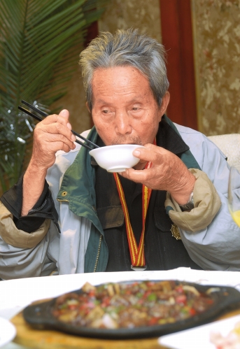 回鍋肉、麻婆豆腐,老人看著桌上地道的川菜有點發(fā)呆,低頭,聞聞!巴夤詨K回鍋肉!背陨霞亦l(xiāng)的肉,老人一定覺得那肉香似曾相識!皝恚覀儦g迎老兵回家!憋堊郎希蠹夜餐e杯祝福,歡迎老人回家。