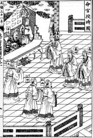 制定歷法,就是“觀象授時(shí)”,對(duì)統(tǒng)治者來(lái)說(shuō)是最重要的事情。天文歷法象征著帝王“君權(quán)神授”的統(tǒng)治權(quán)威。傳說(shuō)堯帝就命天文學(xué)家羲、和二氏進(jìn)行天文觀測(cè)以制定歷法!渡袝(shū)·堯典》說(shuō):“乃命羲和,欽若昊天,歷象日月星辰!碑(dāng)時(shí)是以觀測(cè)日出方位和黃昏時(shí)中天的恒星來(lái)確定季節(jié)。根據(jù)書(shū)中記錄的“中星”天象,可以推斷堯帝“觀象授時(shí)”的年代約在公元前23世紀(jì)。當(dāng)時(shí)制定的歷法是一年有366天,以置閏月的方法保持與季節(jié)同步。