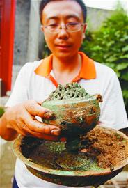 就在記者將要發(fā)稿時(shí),考古工地又傳來(lái)消息,在8月9日最新發(fā)掘的一座漢墓中,出土了幾件重量級(jí)文物:1件銅薰?fàn)t、1件鐵鼎和5個(gè)陶罐,另外在腐爛的棺木下面 還發(fā)現(xiàn)鋪有一層漢代五銖錢,其中最為珍貴的是銅薰?fàn)t。銅薰?fàn)t分為上下兩部分,上為薰?fàn)t,鏤空,有花紋;下為一圓形銅盤,直徑大約有30厘米,薰?fàn)t與銅盤可 以對(duì)插,連接后成為完整的銅薰?fàn)t,高度約為20厘米。