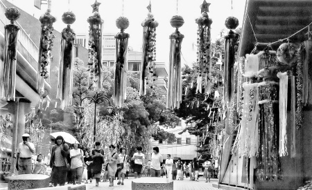 鳥住貞義先生還給我放了一段去年七夕時,枚方市祭掃“七夕神社”的錄像,我看到,前往祭掃的人除了“七夕研究會”的成員外,還有當地的議長、市府官員以及許多民眾。在“七夕神社”的周圍栽了很多竹子,前往祭掃的大人小孩都將自己的心愿寫在一張長紙條上,然后掛在竹子的枝條上,用來祈福。這使我想起日本小鈞市的“七夕文化”,也牽涉到兒童,“七夕”這天早上,凡年滿6歲的兒童在媽媽的陪同下,到野外的莊稼上取些露水回家,然后用露水磨墨寫字。這是一種儀式,代表兒童從這一天起,就開始啟蒙讀書寫字了。據我考證,這是日本和中國“七夕文化”略有不同的地方,其他如七夕夜放河燈,為牛郎與織女照明祝福;一家人在庭院里擺上桌子,沏上香茶,一邊品茶一邊觀看牛郎與織女相會天河的美景;在葡萄架下側耳傾聽牛郎與織女相會時的絮語;姑娘在絲瓜架下默默地向天上‘乞巧’,盼望自己能像織女那般心靈手巧,這些幾乎是相同的!跷/圖 湯禮春
