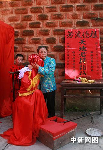 頭頂紅蓋頭的“新娘”在“出閣”前的“哭嫁”讓眾人嘖嘖稱嘆。記者在現(xiàn)場看到,在經(jīng)歷了踩斗、丟筷子、罵媒、父親壓轎等傳統(tǒng)習俗后,“新娘”緊緊抱著自己的“母親”哭道,“女兒家女兒外相,十七八歲選才郎,倘若奴身是男兒,早晚二時奉高堂!睋(jù)當?shù)鼐用窠榻B,“哭嫁”的順序為哭爹娘、哭嬸嬸、哭叔娘和哭姐妹。不少情侶在看完“新娘”的“哭嫁”完后,連連稱贊其“哭功”了得,堪稱一絕。隨后,“新娘”由“哥哥”背上花轎。穿長馬褂、胸戴大紅花的“新郎”則坐上另一臺轎子,帶著女方配置的婚嫁用品浩浩蕩蕩地返回“新郎”家。