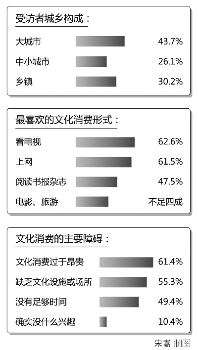 編輯點(diǎn)評(píng):看電視、上網(wǎng),是居民文化休閑活動(dòng)的“主力軍”,折射出我國(guó)民眾的文化消費(fèi)形式還較為單調(diào)。