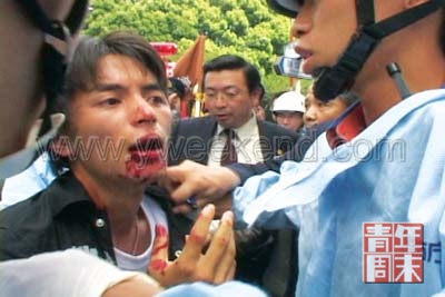 靖國神社內(nèi),眾人向神社行禮參拜,突然,一個學(xué)生模樣的年輕人沖到前面高呼“反對參拜靖國神社!”他很快被撲倒在地,雙方扭打在一起。終于有人竭力拉開了他們,又有一位老者上前,緊逼著他走了很遠(yuǎn),并不住呵斥:“滾回中國去!滾回中國去!”年輕人一言不發(fā),但這長達(dá)幾分鐘的反復(fù)呵斥令這些中國觀眾有些難以忍受。一直用攝像機(jī)記錄這一過程的李纓當(dāng)時(shí)也急切地想驗(yàn)明這個年輕人的身份,于是,在旁邊所有人都把這個反對參拜靖國神社的年輕人當(dāng)作中國人的時(shí)候,李纓小心翼翼地問了一句:“是中國人嗎?”“不,我是日本人!