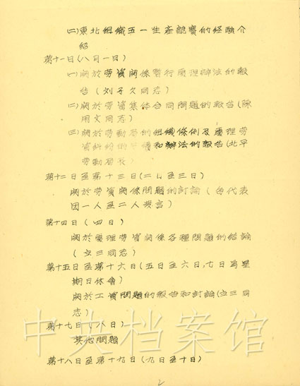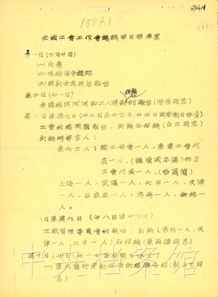 1949年7月23日至8月16日,全國工會工作會議在北平舉行。出席會議共有省、市、區(qū)72個單位的代表254名。毛澤東、朱德、周恩來等先后到會講話,李立三作了關(guān)于工會組織的報告。這次會議規(guī)定了當(dāng)時全國工會工作的中心任務(wù),就是在一年左右基本上把全國工人階級組織起來,以便在新中國的政權(quán)建設(shè)和經(jīng)濟建設(shè)中勝利地擔(dān)負起領(lǐng)導(dǎo)階級的歷史使命。會議通過了《關(guān)于勞資關(guān)系暫行處理辦法》等四個文件,明確了在新民主主義政權(quán)下處理勞資關(guān)系的正確途徑。