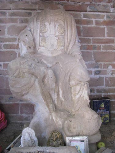 據(jù)國(guó)家文物局網(wǎng)站消息,該造像砂石圓雕,頭已殘失,高120厘米,寬65厘米,厚50厘米,坐于樹根狀座上,左腿自然下垂,跣足踏一類似玄武的物體,左手平置于左膝,右腿上屈置于座面上,右腳殘缺。坐姿類似于觀音的游戲坐,披發(fā)跣足,外著大衣,內(nèi)著鎧甲,胸部為人字形護(hù)心鏡,胸系絆帶,腰扎英雄巾。座后方刻凌亂文字?jǐn)?shù)行,大多已漫漶不可辨識(shí),依稀可見“神□七年”、“正大二□”等。