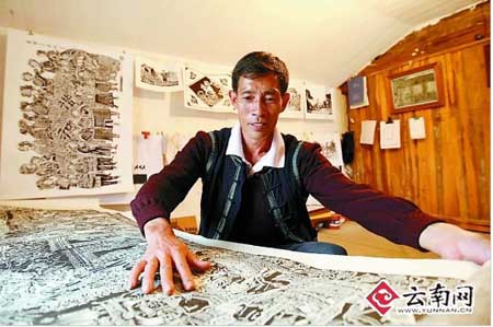盧正林所在的馬關縣仁和鎮(zhèn)阿峨新寨村是一個壯族世居村寨,得天獨厚的自然環(huán)境養(yǎng)育了聰慧、勤勞的新寨人。他們在創(chuàng)造物質財富的同時,也創(chuàng)造了絢麗多彩的民族民間文化,其民居、服飾等無不蘊含著濃郁的鄉(xiāng)土氣息和壯族韻味。繡花衣、花帽、裙子、圍腰等壯族刺繡被他們描在紙上、畫在木板上,最終刻在版上。經過多年的發(fā)展,全村男女老少基本都會制版畫。如今,在縣委、縣政府的引導支持下,村里成立了版畫協會,目前會員已發(fā)展至50多名。版畫正成為村民致富的一大產業(yè)。(徐雁)
