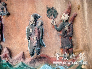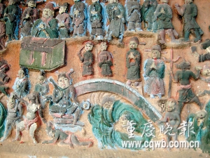 長壽區(qū)但渡鎮(zhèn)未名村龍溪河邊的一塊懸崖峭壁上,雕刻著100個形形色色的人物,不僅有黑白無常、牛頭馬面等諸多冥界人物,圖畫還繪聲繪色地展示著,死去的人們魂魄過奈何橋、做惡者上刀山、下火海遭受種種酷刑的場景。